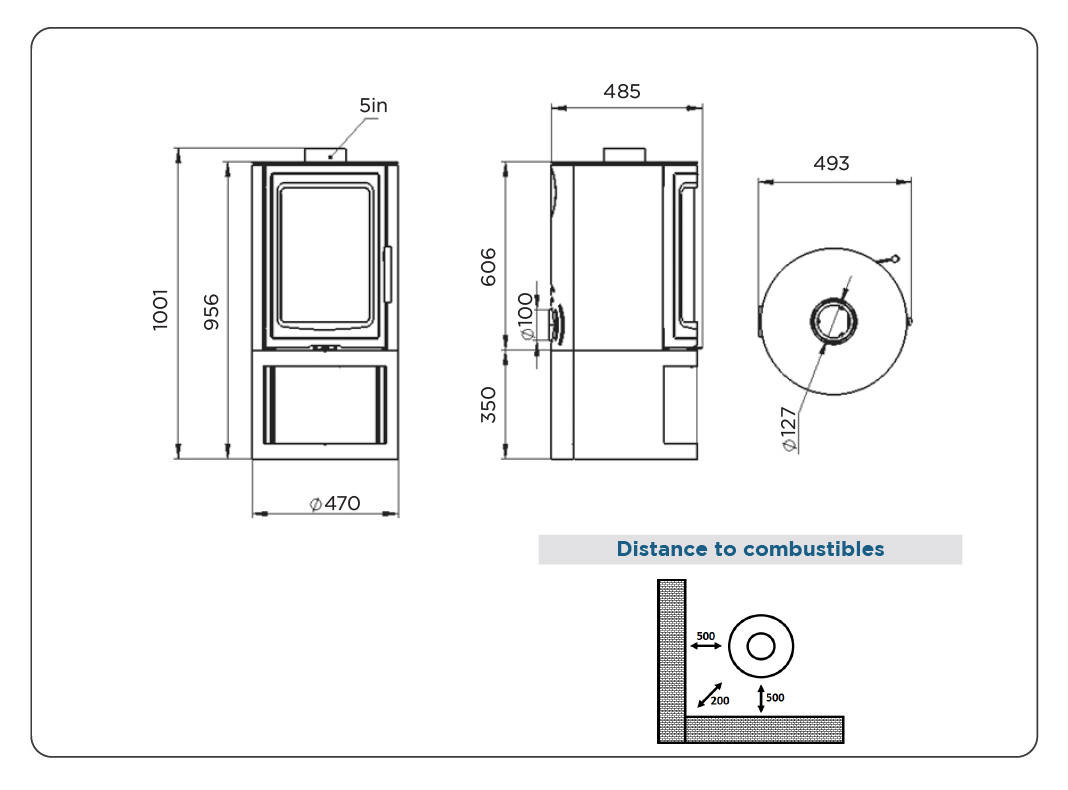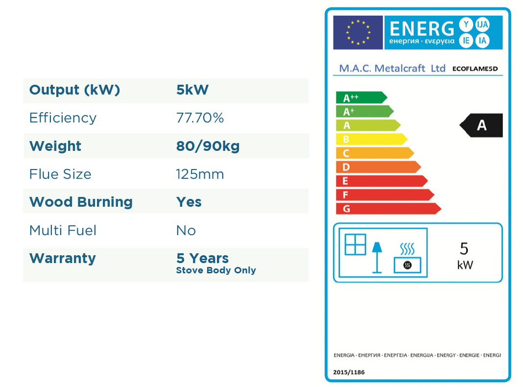 Ecoflame cylindrical stoves come as standard with our uniquely designed heavy duty cast iron door and 125mm outlet. The stove can be installed using a direct air kit.