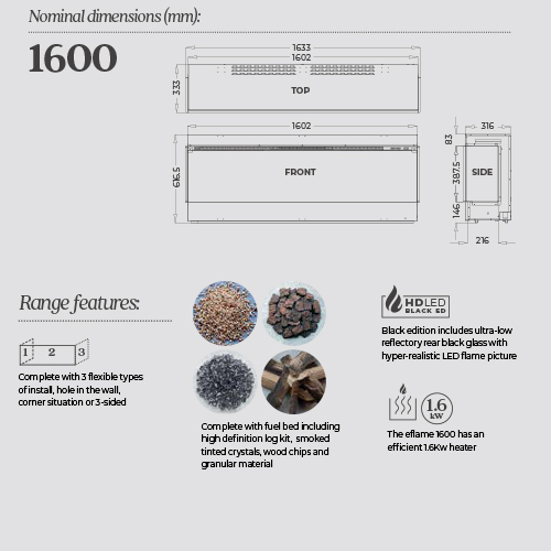 The eflame 1600 is designed with the latest LCD technology along with darkened rear glass to reduce reflections and give the most realistic flame effect available in an electric media wall fire. The flame effect can be set to XX different settings and XX sound effects all from the comfort of your chair using your phone, tablet or supplied remote control..