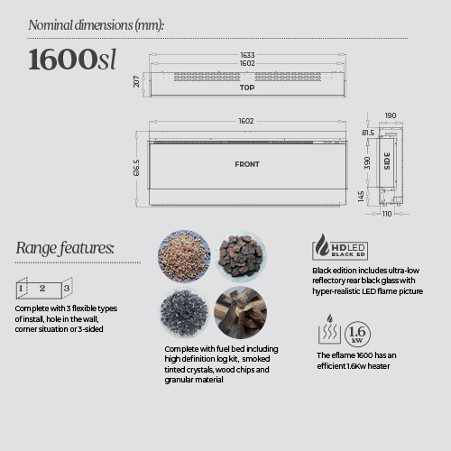- Ultra-realistic LED flame picture on non-reflective darkened glass