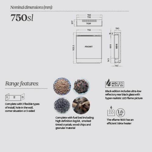 - Ultra-realistic LED flame picture on non-reflective darkened glass